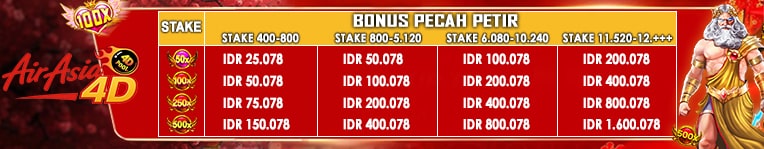 *STAKE SPIN MIN BET 1.000 - 4.999: 5 SCATTER - BONUS 50.000 6 SCATTER - BONUS 100.000 *STAKE SPIN MIN BET 5.000 - 9.999: 5 SCATTER - BONUS 150.000 6 SCATTER - BONUS 300.000 *STAKE SPIN MIN BET 10.000 - 99.999: 5 SCATTER - BONUS 300.000 6 SCATTER - BONUS 600.000 Syarat & Ketentuan : 1. Event Scatter Berlaku hanya pada provider Slot Pragmatic yang ada di menu utama Slot Pragmatic (Bukan dimenu SBO Slot & Games). 2. Minimal Stake SPIN Rp. 1.000,- 3. Event ini Khusus Untuk Jenis Slot PRAGMATIC Pada List Di Bawah Ini. - Gates of Olympus - Gates of Olympus 1000 - Gates of Olympus Dice - Starlight Princess - Starlight Princess 1000 - Starlight Christmas - Gates of Gatot Kaca - Gates of Gatot Kaca 1000 4. Event tidak berlaku jika claim dengan menggunakan fitur BUYSPIN/BELI SPIN. 5. Maksimal Per 1x claim Bonus Scatter Rp.333.333 Dan Maksimal Claim 3x Perhari, Maksimal Bonus Rp. 1.000.000 / Perhari.( PER 1 USER ID ) 6. Setelah Mendapatkan Scatter Wajib Langsung Screen Shoot Yang Menunjukkan Hasil Akhir Dari Total Kemenangan. (Screenshoot layar penuh / full screen dan tidak boleh ada editan) 7. Boleh Dimainkan Atau Tunggu Sampai Freespin Selesai ,Wajib Screenshoot Hasil akhir Total Kemenangan. 8. Diwajibkan posting Screenshoot hasil di Grup Official Facebook AIRASIA4D Disertai Username Dan Jenis Claim : Contoh : - Username = AIRASIA4D - jenis Claim = Event Scatter Maka Format Postingan Adalah Hasil SS Di Sertai Username Dan Jenis Claim AIRASIA4D Event Scatter 9. Klaim Bisa Dilakukan Melalui Admin LiveChat Official AIRASIA4D. 10. Event Scatter akan Di Reset Setiap Hari Pukul 00.00 WIB 11. Promo dapat berubah sewaktu-waktu tanpa pemberitahuan. 12. Jika ditemukan indikasi kecurangan, Management berhak membatalkan event tersebut dan menarik kembali bonus dan kemenangan, serta memberikan peringatan keras kepada user id yang telah melakukan kecurangan. 13. Event Tidak Berlaku Double Claim Dengan Event Yang Lain ( 1X Claim Hanya Untuk 1 Event ) 14. Keputusan Management AIRASIA4D bersifat Mutlak.