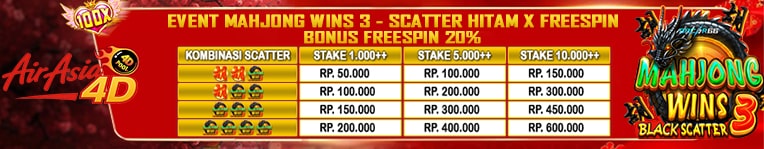 MAHJONG WINS 3 BLACK SCATTER 1. Event Hanya Berlaku Khusus Untuk Game Slot MAHJONG WINS 3 (Pragmatic Play). 2. Minimal Stake Adalah Rp 1.000,- Untuk Mengikuti Event Ini. 3. Syarat Untuk Mendapatkan Bonus Adalah Minimal 3 Scatter Dengan Kombinasi 2 Merah 1 Hitam atau 1 Merah 2 Hitam dan Lain nya. ( minimal ada 1 scatter hitam ) 4. BONUS EVENT SCATTER HITAM - STAKE SPIN MIN BET 1.000++ 1 SCATTER HITAM - BONUS 50.000 2 SCATTER HITAM - BONUS 100.000 3 SCATTER HITAM - BONUS 150.000 4 SCATTER HITAM - BONUS 200.000 - STAKE SPIN MIN BET 5.000++ 1 SCATTER HITAM - BONUS 100.000 2 SCATTER HITAM - BONUS 200.000 3 SCATTER HITAM - BONUS 300.000 4 SCATTER HITAM - BONUS 400.000 - STAKE SPIN MIN BET 10.000++ 1 SCATTER HITAM - BONUS 150.000 2 SCATTER HITAM - BONUS 300.000 3 SCATTER HITAM - BONUS 450.000 4 SCATTER HITAM - BONUS 600.000 5. BONUS EVENT FREESPIN - Minimal Menang FREESPIN IDR 300.000 baru bisa claim BONUS EVENT FREESPIN 20%. - CONTOH : Menang FREESPIN IDR 301.000 x 20% = Bonus Rp 60.200 6. Maksimal Per 1x claim Bonus Scatter Hitam X Freespin Adalah Rp 333.333 dan maksimal klaim 3x perhari per akun Maksimal bonus IDR 1.000.000 / hari. ( PER 1 USER ID ) 7. Event Berlaku Double Claim Dalam 1 Periode 8. Untuk Claim Di Wajibkan Posting Di Group Official Facebook BDGROUP Dengan Cara Screenshoot Hasil Kemenangan Anda Yang Nampak Kode Transaksi Game Dan Anda Bisa Ambil Dari Riwayat Bermain ( Riwayat Biasa nya akan terupdate kurang lebih 5 menit setelah anda bermain di periode tersebut ) - Format Postingan Adalah Hasil Screenshoot Di Sertai Username Dan Jenis Claim AIRASIA4D EVENT SCATTER HITAM X FREESPIN EVENT MAHJONG WINS 3 9. Klaim Bisa Dilakukan Melalui Admin LiveChat AIRASIA4D. 10. Bonus Akan Di Proses 5 - 30 Menit Setelah Pengecekan. 11. Claim Hanya Berlaku Di Hari Yang Sama Dan Event Akan Di Reset Setiap Jam 00:00 WIB. 12. Promo dapat berubah sewaktu-waktu tanpa pemberitahuan. 13. Semua keputusan dari Management AIRASIA4D bersifat mutlak dan tidak dapat diganggu gugat.